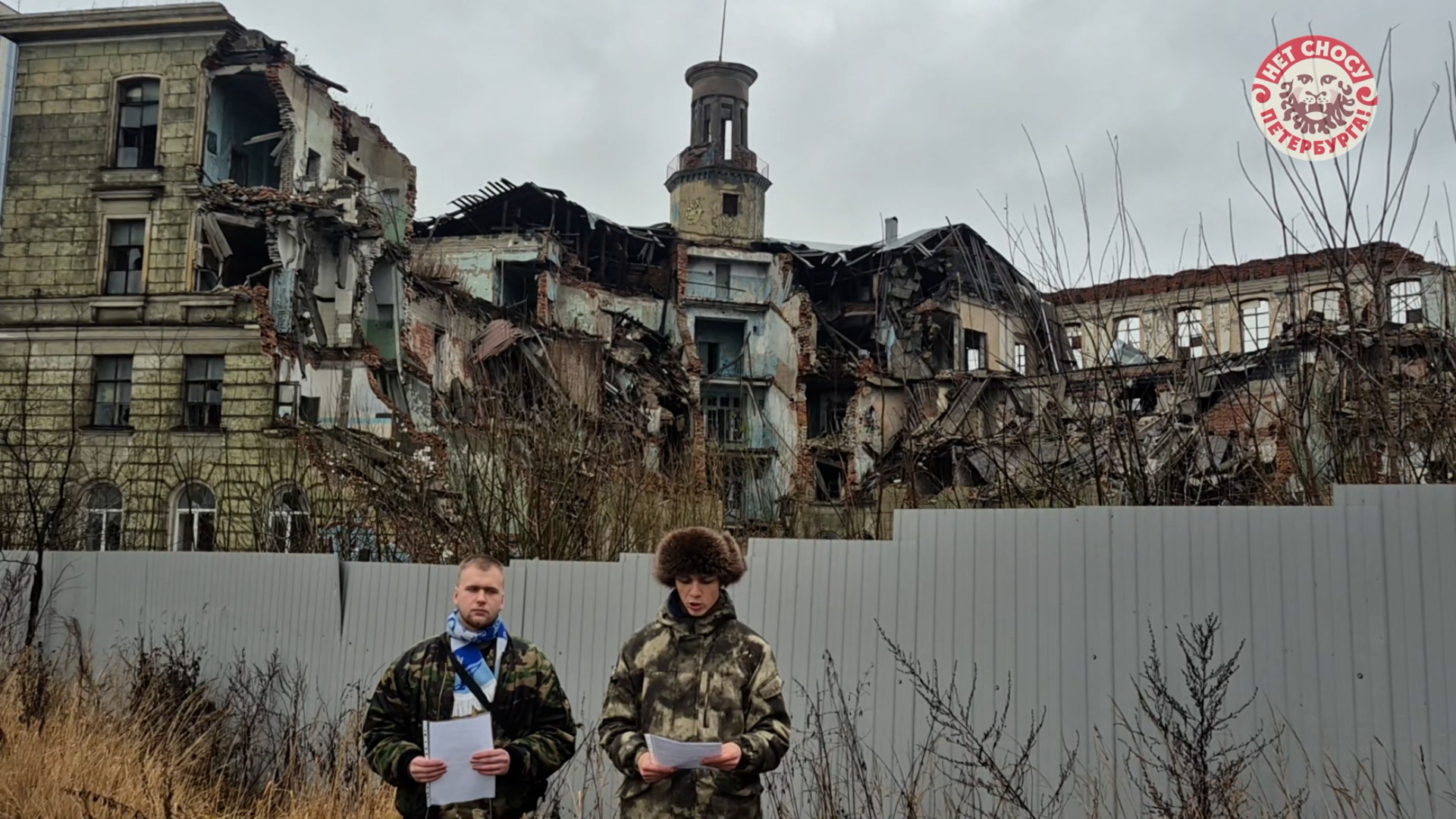 За спиной у молодых людей — полуразрушенный научный центр ракетных войск. «Мы записываем это видео из Петербурга, хотя может показаться, что мы всё еще там, за ленточкой», — говорит Зайцев. Он объясняет, что здание пострадало не от ракетного удара или дронов: «его под апартаменты продали наши чинуши, а потом хапуги-застройщики демонтажной техникой рвали стены сталинского ампира на куски».