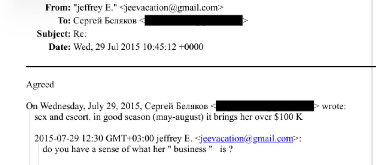 Так, в июле 2015 года Сергей Беляков искал информацию по просьбе Джеффри Эпштейна о некой девушке из Москвы — якобы та шантажировала бизнесменов в Нью-Йорке. Беляков взялся за поиск информации без лишних вопросов и через пару дней ответил, что упомянутая россиянка занимается эскортом и в хороший сезон — с мая по август — получает более 100 тысяч долларов.